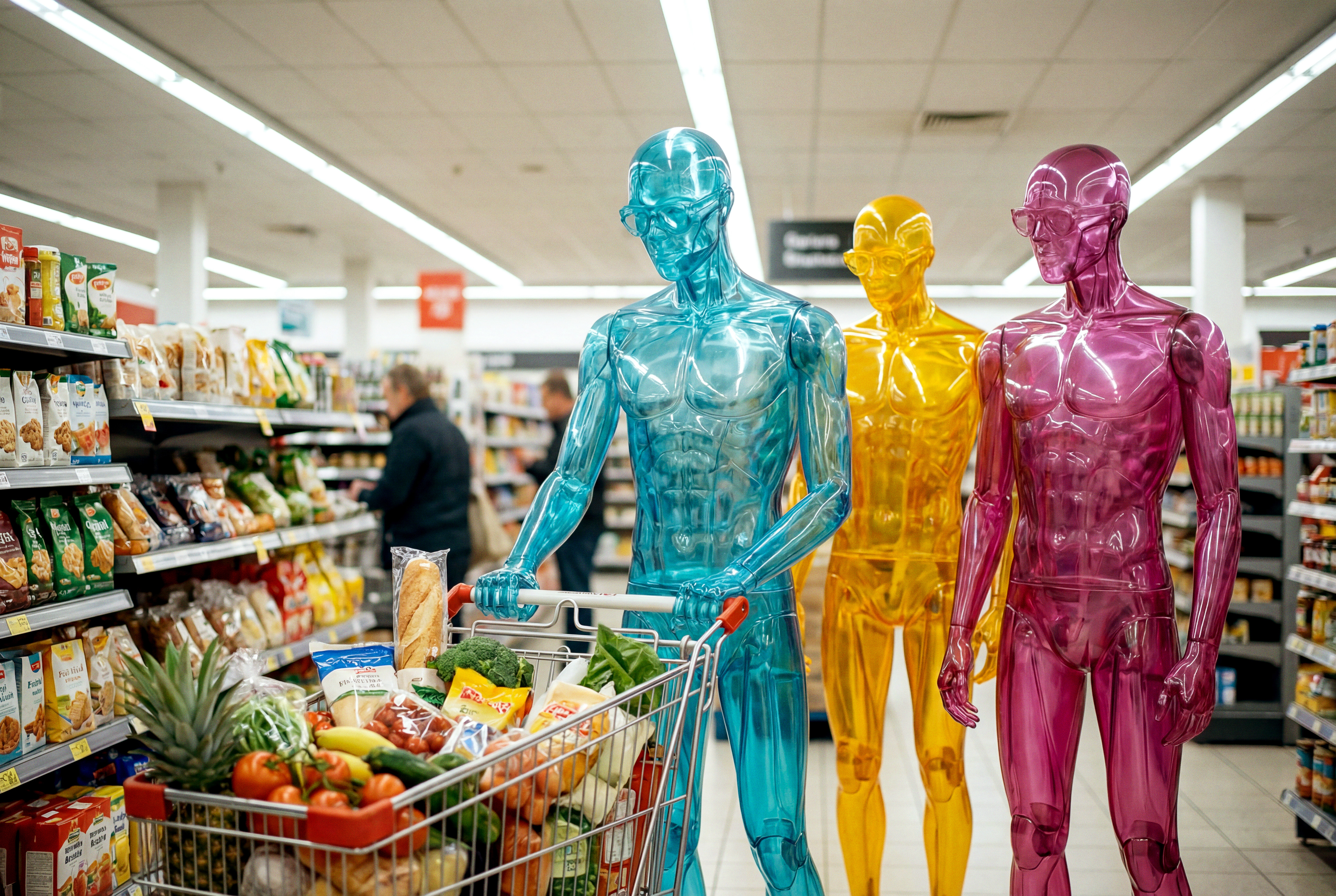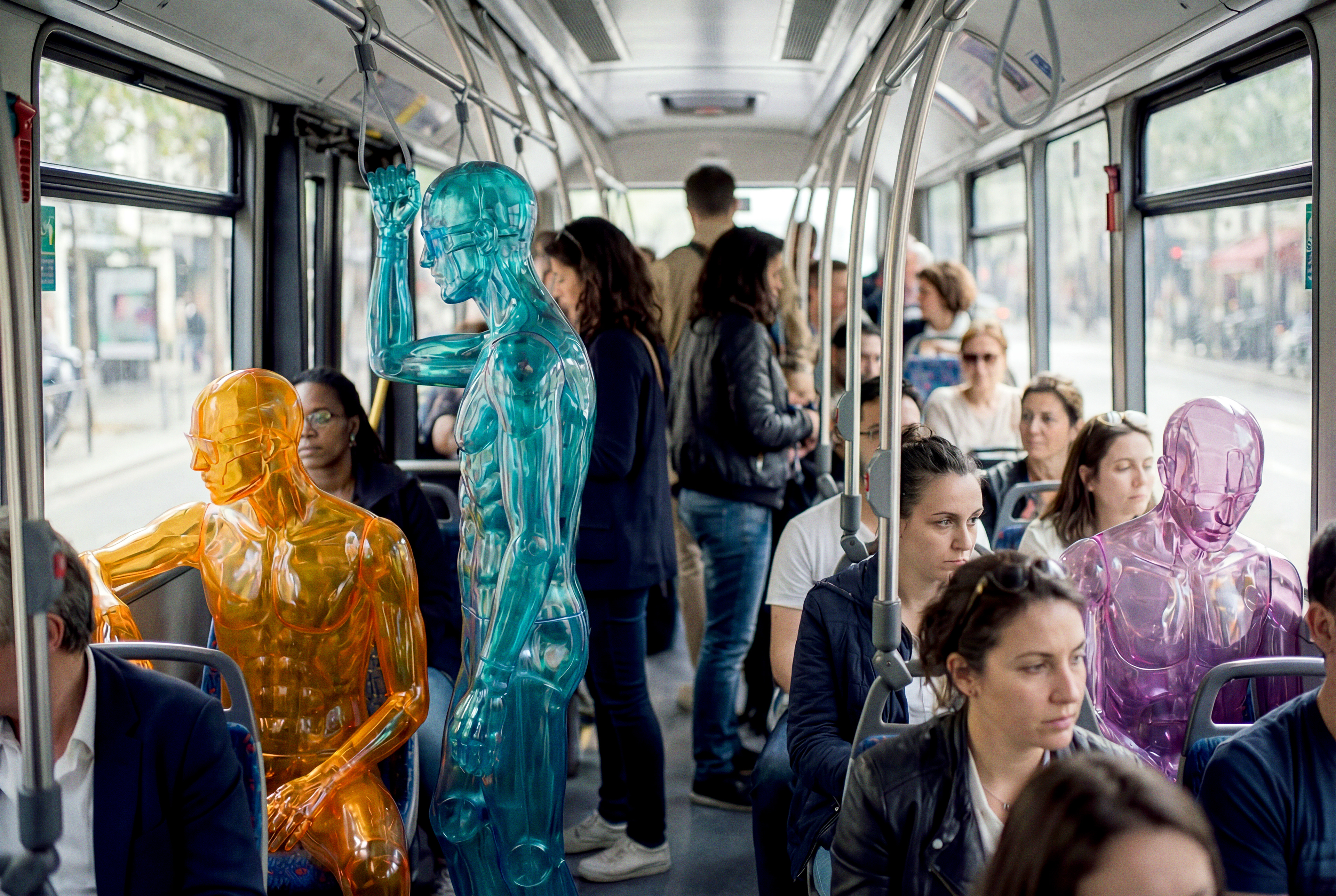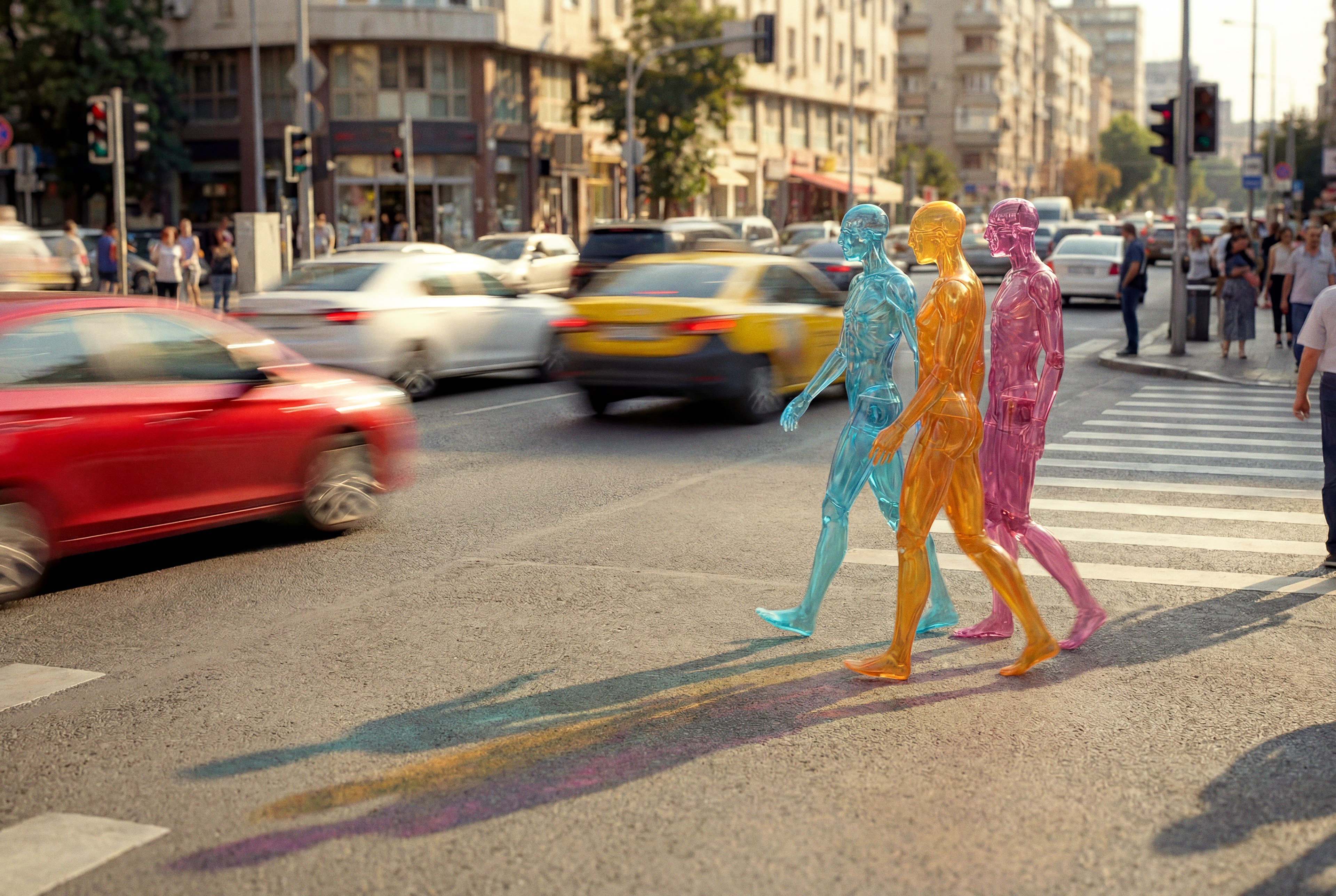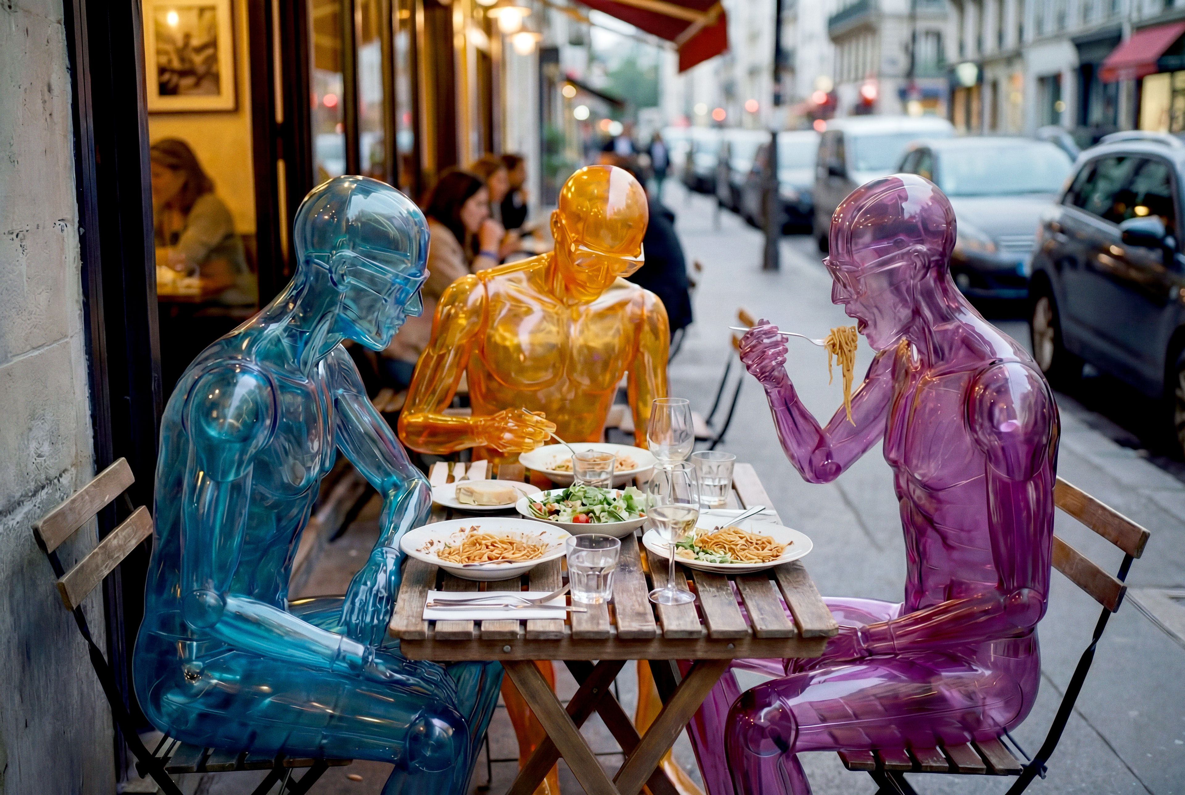 The humans appear solid, visible, and physically present, yet reduced to a single translucent color. They exist inside familiar everyday scenes — eating, walking, shopping, waiting . Moments where life happens quietly and continuously.